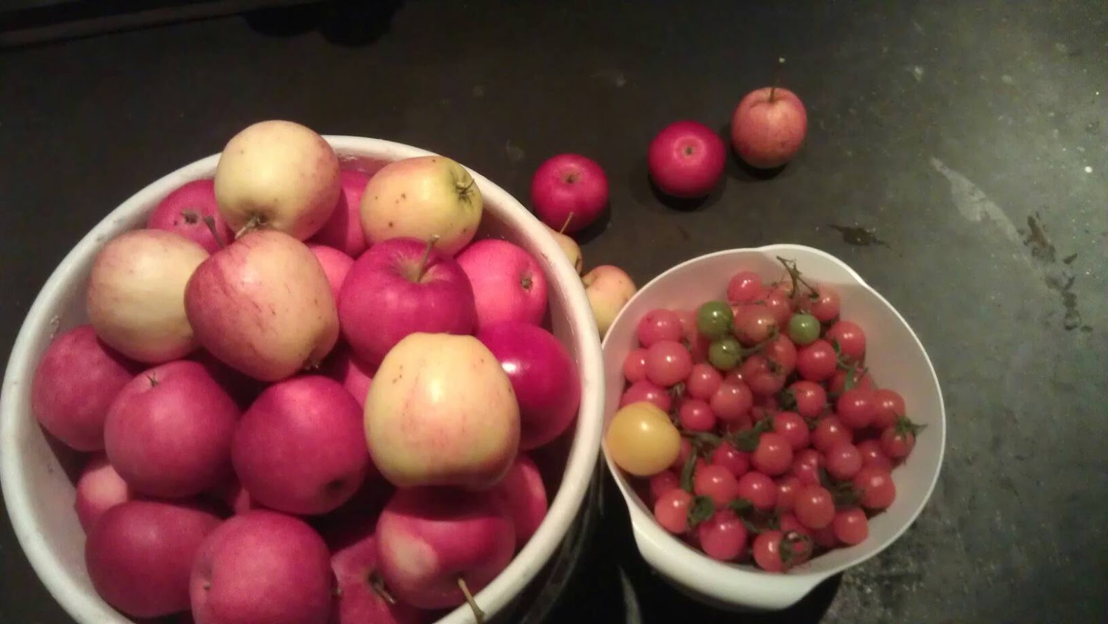 Det blev lite att skörda ändå... Det här är kvällens ranson: en hink äpplen från två av äppelträden och en skål tomater från växthuset. Och även fast det börjar bli lite svalare ute nu så finns det en hel del tomater kvar som väntar på mer färg. Någon vecka till eller så får de nog vara kvar därute innan jag plockar in dem på eftermogning i köksfönstret.